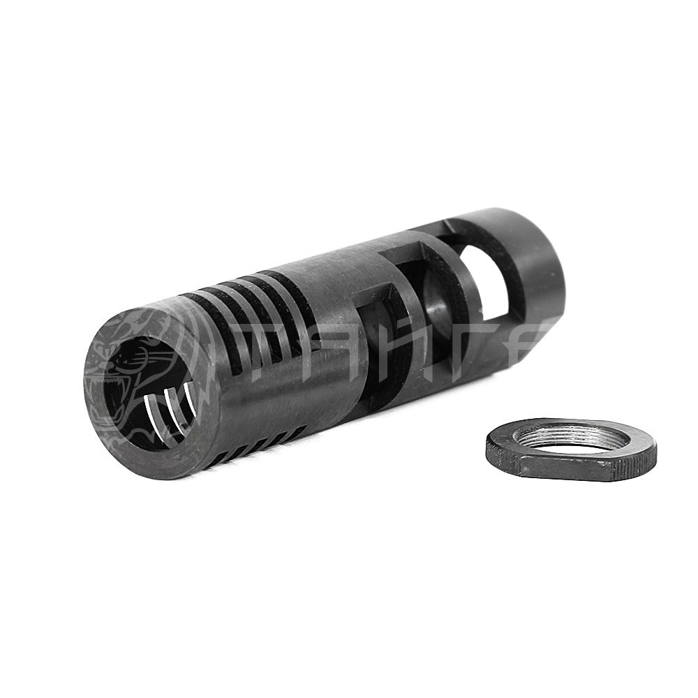 Для фиксации дульного тормоза-компенсатора на стволе в нужном положении его необходимо зажать гайкой, вращая ее в противоположную сторону.