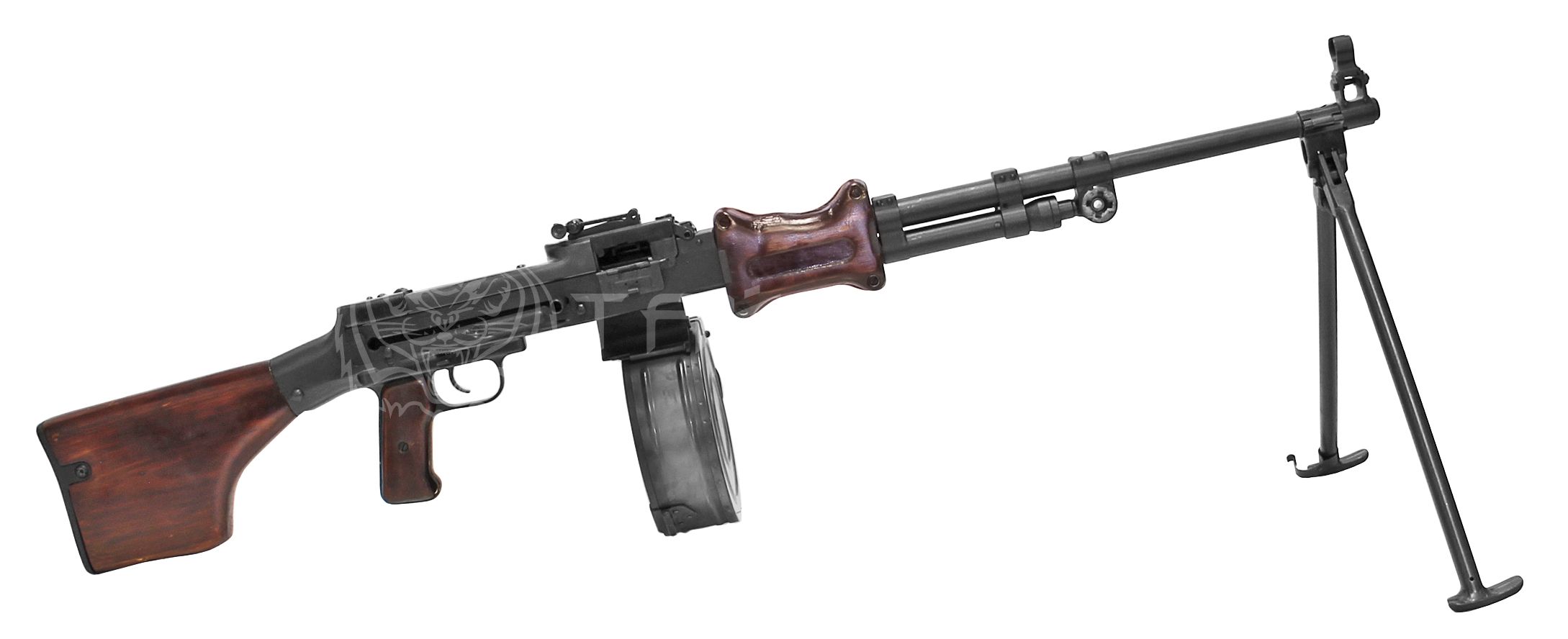 Боевой ручной пулемет, переделанный под стрельбу холостыми патронами калибра 7.62х39, точно такими же как стреляет охолощенный АКМ. Во время стрельбы патроны подаются из ленты, а гильзы улетают через выбрасыватель.
