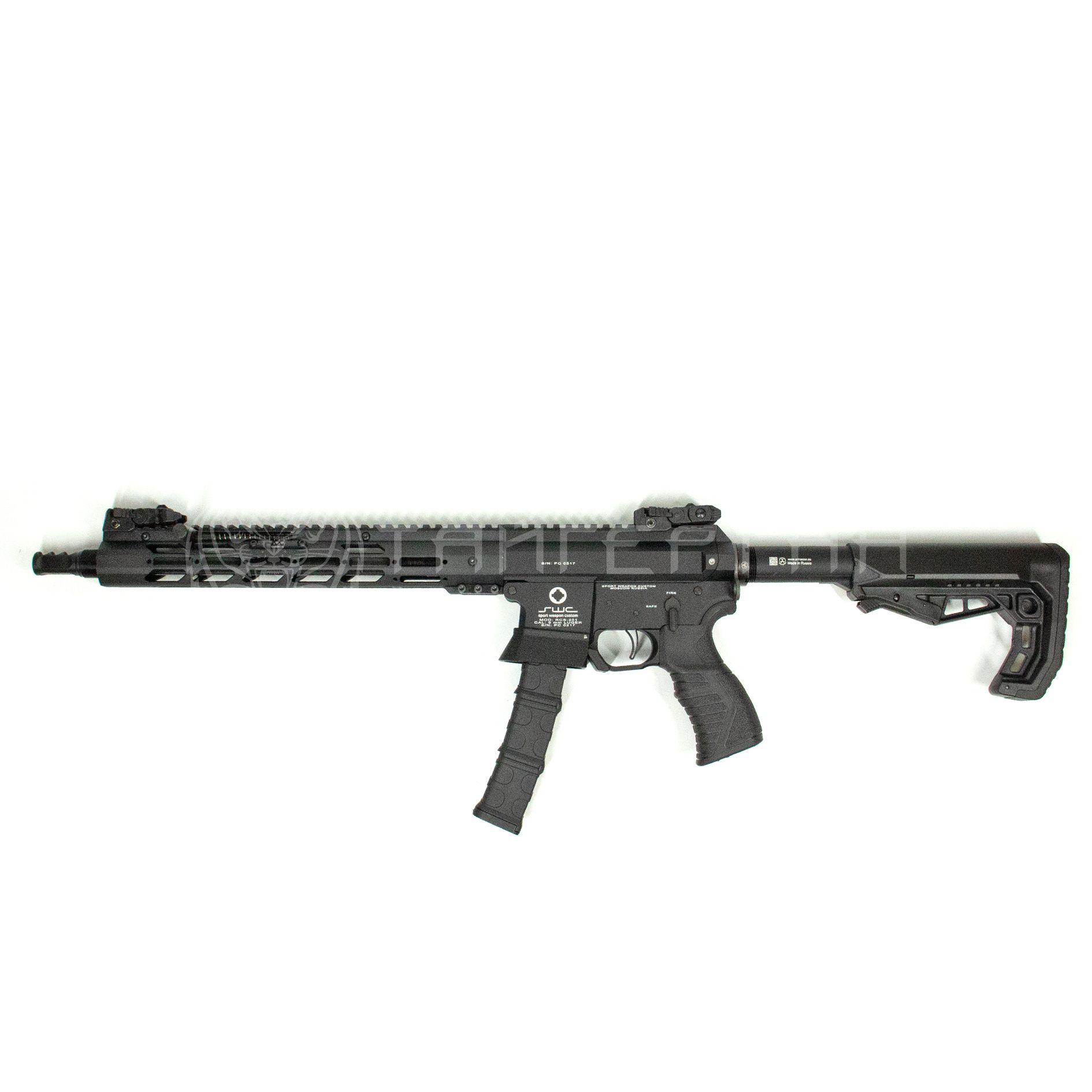 Карабин SGS-202 калибра .345 ТК от российского производителя SWC позиционируется как спортивное оружие, но может использоваться и как охотничье. Отличительные особенности модели - тактическое исполнение, легкость и компактность, возможность регулировки усилия спуска. - вентилируемое цевье; - кованный карбонитрированный ствол длиной 36 см; - облегченный алюминиевый корпус; - удлиненная наствольная RIS-планка для установки тактических аксессуаров; - складные прицельные приспособления; - телескопический приклад; - стандартная комплектация - карабин, приклад, ручка и ДТК SWC; (-/-)