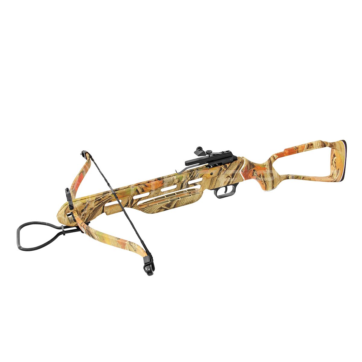Арбалет Man Kung MK-150 A2AC R – легкая и прочная модель, корпус которой изготовлен из алюминия. Арбалет имеет легкий рамочный приклад. Дуги модели сделаны из композитного материала – фибергласс. Корпус арбалета имеет светлую камуфляжную расцветку и красиво смотрится. Прицельная планка сделана из железа, и может регулироваться. Крепление ласточкин хвост шириной 11 мм. позволяет поставить оптический или коллиматорный прицел. С арбалетом поставляются две стрелы, поэтому арбалет можно сразу опробовать в деле. Вес арбалета всего 2,5 кг, поэтому с ним легко управляться и переносить. Автоматический предохранитель способен обеспечить безопасность использования. Арбалет предназначается для тренировочной и развлекательной стрельбы на дистанции на уровне 25 метров.