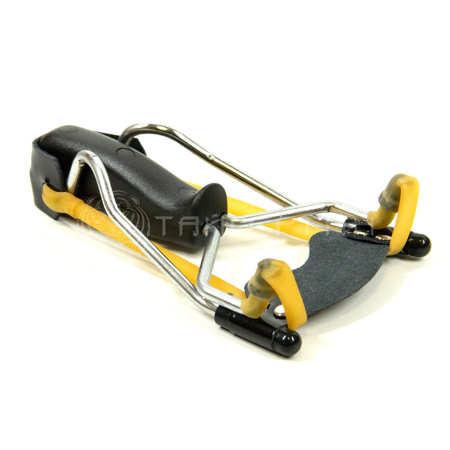 Надежная и утилитарная складная рогатка с упором для предплечья. Дизайн этой рогатки довольно популярен среди прочих производителей, однако данная модель имеет важное техническое преимущество: Рога и упор представляют собой общий каркас, выполненный из хромированного металла толщиной 6 мм. Кроме того, упор в боевом положении упирается не в пластиковую рукоятку, а в специальный металлический ограничитель, также являющийся частью стального каркаса. Рукоятка жестко крепится к каркасу тремя болтами, закрытыми заглушками. (-/-)