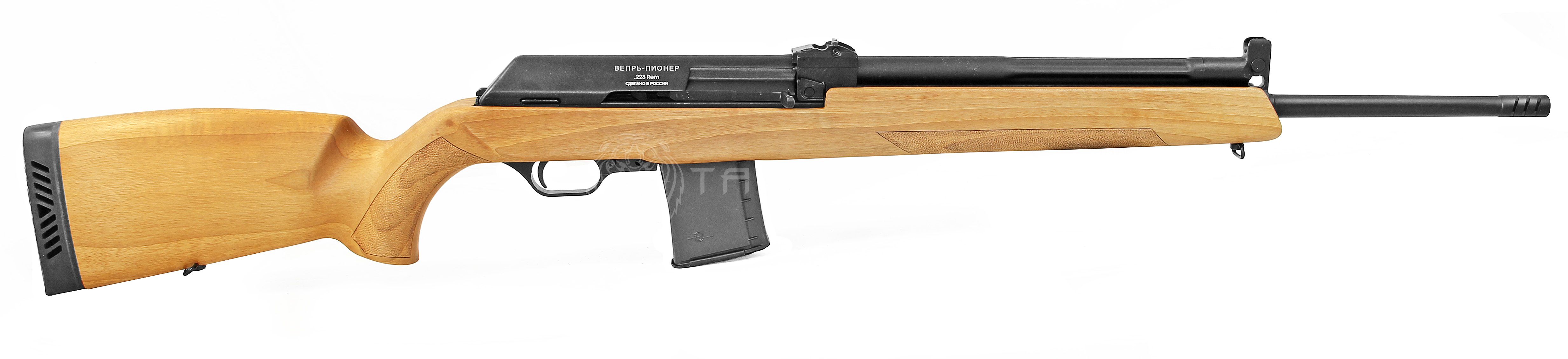 "Вепрь-Пионер" - самозарядные охотничьи карабины с длинной ореховой ложей, выполненной по типу 'Монте-Карло'. Выпускаются под патрон калибра .223 Rem (5,56х45). Классическая цельная ложа с полупистолетной рукояткой. Наличие дульного тормоза-пламегасителя гарантирует малую энергию отдачи при стрельбе.