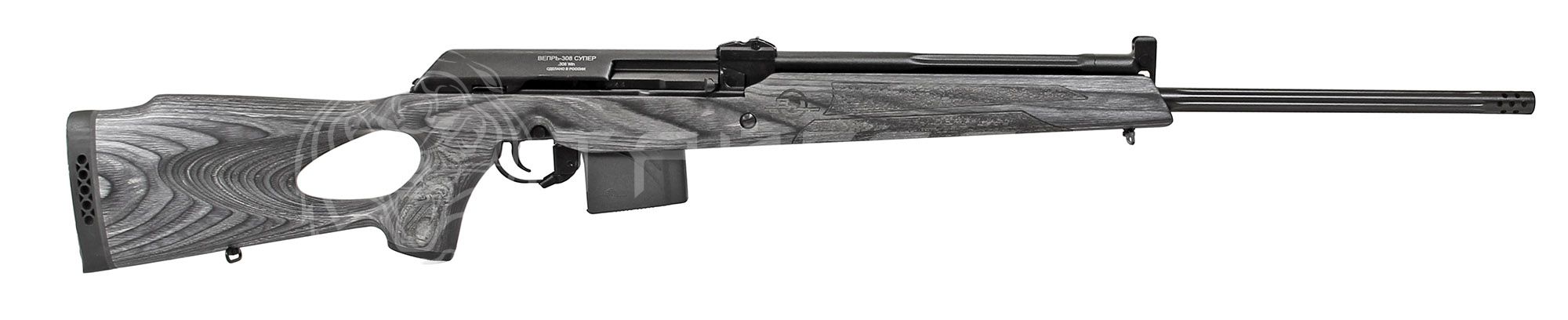 Вепрь-Супер (СОК-97М) б/о – это охотничий карабин с длинной ложей, в которой сделан вырез под большой палец. Форма приклада эргономична и удобна, он отлично захватывается с любой руки и позволяет стрелять из любого положения. Дульная часть ствола оснащена дырочным дульным тормозом. На поверхности ствола имеются продольные пазы для ускорения его охлаждения, а также для снижения общего веса винтовки.