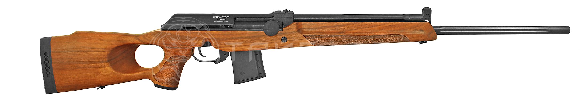 Карабин Вепрь Супер (СОК-97М) б/о с 650-миллиметровым стволом имеет охотничье назначение. Он способен демонстрировать отличные показатели стрельбы при температуре в пределах от -50 до +50 градусов по Цельсию. Открытые прицельные приспособления винтовки следующие: перекидной двухпозиционный прицел на 100 и 300 м, а также регулируемая в двух плоскостях мушка. На поверхности стального ствола расположены продольные пазы, позволяющие снизить общий вес винтовки и обеспечить ее более быстрое охлаждение после стрельбы. Эргономичная ложа оснащена щекой и затыльником из резины для комфорта охотника.