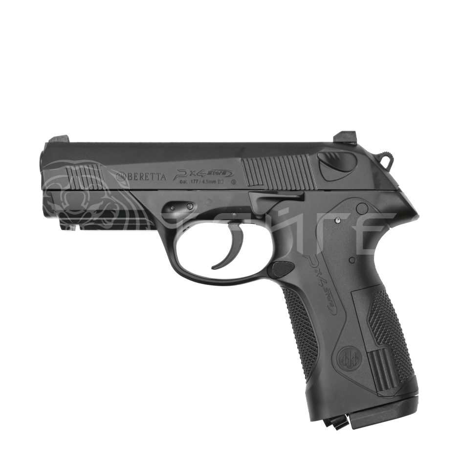 Модель Px4 — современная платформа от компании Беретта. Это изделие относится к полицейскому форм-фактору — пистолеты этого типа разрабатывают исходя из повышенных требований к комфортабельности ношения и плавности работы. Также категорию используют для нужд самозащиты. За исключением ряда доработок пневматическая Beretta Px4 Storm изготовлена в соответствии с видом оригинального пистолета. Оружие соответствует его габаритам, текстуре покрытия и ряду маркировочных обозначений. Как и прототип, пневматическая Беретта получила полимерную рамку со скругленными формами, что улучшило удобство размещение изделия в кобурах и специальных сумках. Отсутствие грубых элементов исключает зацепление за элементы ткани и фурнитуры, следовательно, оружие извлекается беспрепятственно. Пневматический пистолет Beretta получил доработку в виде изменившегося переключателя режима. Теперь предохранитель расположен справа, на рамке, вместо размещения на затворе. Увеличенный размер кнопки упростил постановку в режим стрельбы. При этом в механизм встроен дополнительный рычажок, без оттягивания которого провести сдвиг лапки предохранителя не получится. Задача узла — исключить случайное переключение и выстрел соответственно. Для высвобождения клавиши нужно прожать рычажок. Пистолет Umarex Beretta уникален комбинированным питанием — для стрельбы допускается использование как 4.5 миллиметровых шариков, так и свинцовых пулек того же калибра. Под эту возможность инженеры создали не менее интересный магазин. По его краям установлены барабанчики под каждый вид зарядов. Их общая емкость составила 16 мест. Исходя из показаний хронографа пневматический пистолет Umarex выдает 110-115 метров в секунду шариками и 120-125 метров в секунду при использовании свинцовых зарядов. Ударно-спусковая группа работает в двух режимах — с предварительным и самозарядным взводом курка. Помимо этого, оружие оснастили опцией подвижного затвора. Пневматические пистолеты Umarex Beretta также оснастили эксклюзивным механизмом накола баллона 12 грамм. Сняв накладку пользователю потребуется отвести маховик предварительного поджима и поставить баллон. После этого необходимо собрать все обратно и перейти к имитатору пятки — деталь отвечает за окончательный накол пломбы. Взяв пневматический пистолет Беретта в руку понадобится провернуть элемент по часовой стрелке, после чего оружие будет заправлено. Такой подход увеличивает скорость подготовки к бою. (-/-)