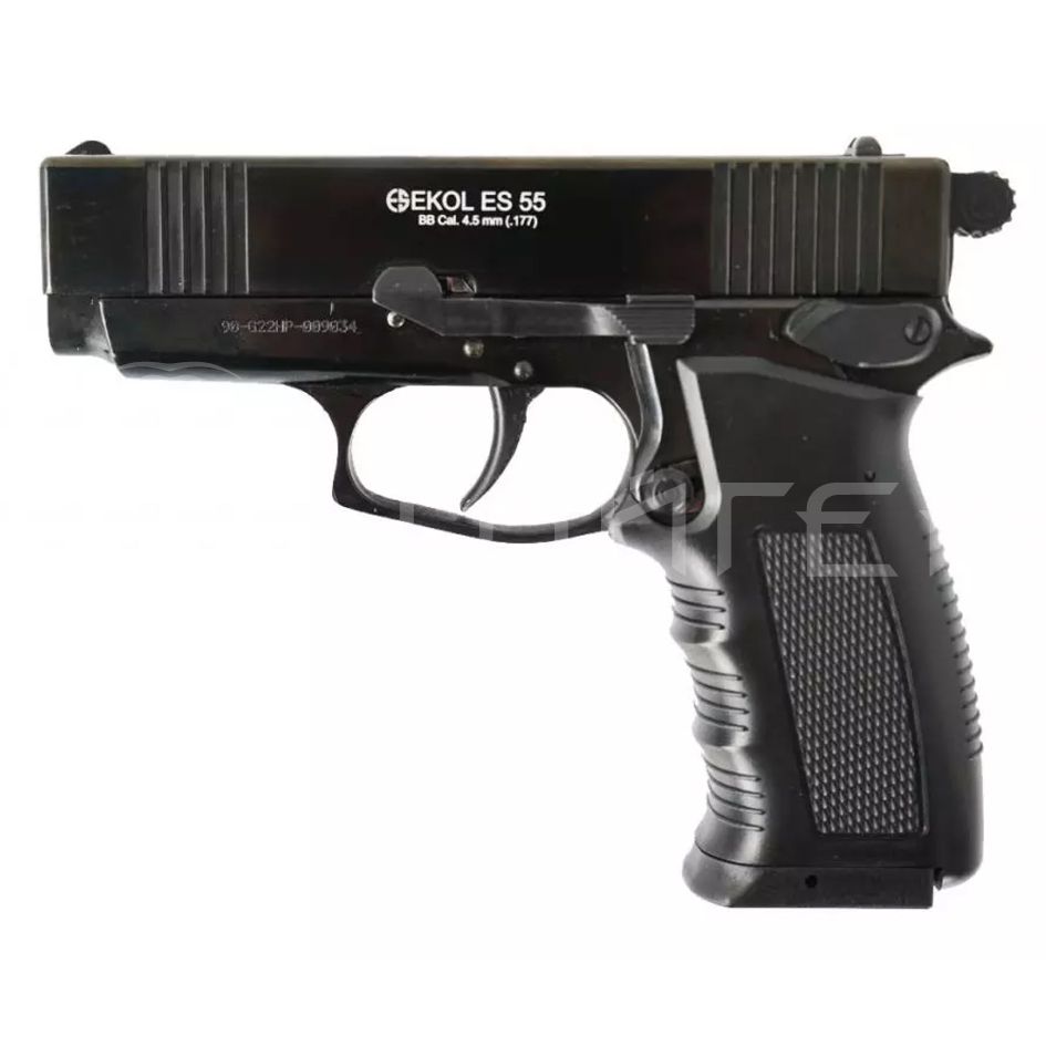 Пневматический пистолет Ekol ES 55 использует в качестве источника энергии 12-граммовые баллончики с углекислым газом. Ударно-спусковой механизм - двойного действия: взвести курок можно как вручную, так и нажав спусковой крючок; курок при этом будет взводиться автоматически. Особенностью этой модели является то, что ее затвор подвижен только при извлеченном магазине, блоубэка нет, рычаг затворной задержки - муляж. Затвор и рамка пистолета Ekol ES 55 выполнены из металла, накладки на рукоять - пластиковые. Магазин - полноразмерный, вместимостью 14 шариков, с отсеком под баллончик с углекислым газом; подаватель с фиксатором. Предохранитель отсутствует, но имеется декокер - рычаг, при помощи которого можно снять курок со взвода. Прицельные приспособления - целик и мушка без возможности регулировки. (-/-)