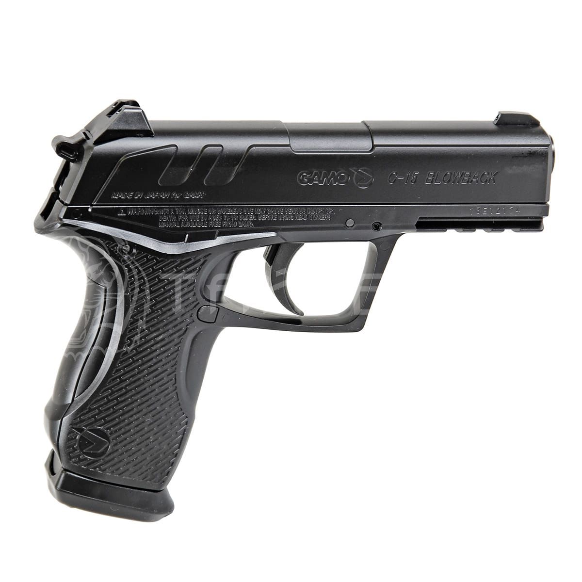 C-15 Blowback - это пистолет компании "GAMO" общей массой при полной нагрузке 700 г, длина пистолета - 19 см. Эта модель имеет прицельные приспособления фиксированного типа, оснащенные окрашенными в белый цвет целиками, все элементы управления его сделаны симметричными, чтоб облегчить работу и правши, и левши.