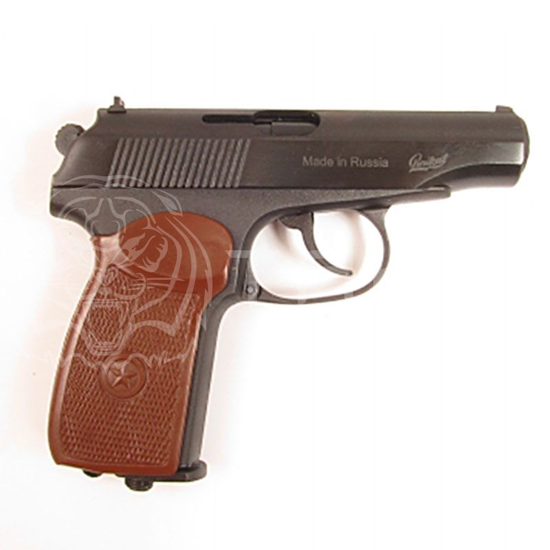 Ствол имеет стальной нарезной. Стреляет сферическими пулями ВВ, калибра 4,5 мм. Источником энергии служат СО2 8-ми гр. (через переходник), 12 граммовые баллоны отечественного производства или импортные аналоги. Магазин пистолета вмещает 13 шариков, вставляется в рукоятку. Магазин съёмный, выполнен моноблоком, куда снаряжаются шарики и баллон СО2. Фиксируется пружинной защёлкой за низ магазина. Рукоятка пластиковая.