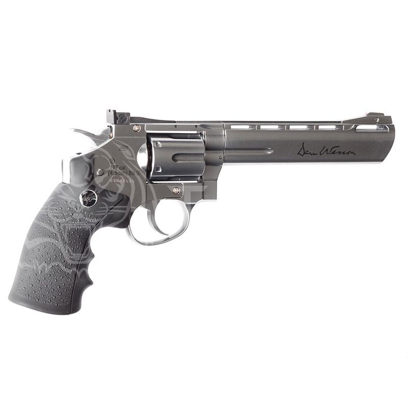 Пневматический револьвер Dan Wesson 6" Silver - это точная копия популярного револьвера с максимальным функционированием всех подвижных частей — полная имитация зарядки боевого револьвера, возможность использования приспособления для быстрой зарядки фальшпатронов, предварительный взвод, регулируемая прицельная планка, возможность установки планки Вивера. Производство фирмы ASG (Дания).