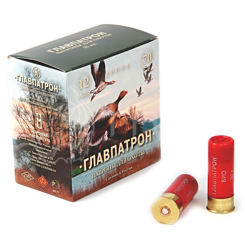 Дробовые патроны 12/12/70 «Био» снаряжаются с навеской дроби 32 грамма. Применяются пыжи «Био» Н24. Пыж «Био» не имеет контейнера и позволяет получить широкую осыпь дроби на средних (~ 30 метров) дистанциях стрельбы. Порох: G3000. Способ закрытия гильзы – звезда. Упаковка – 25/250 шт.
