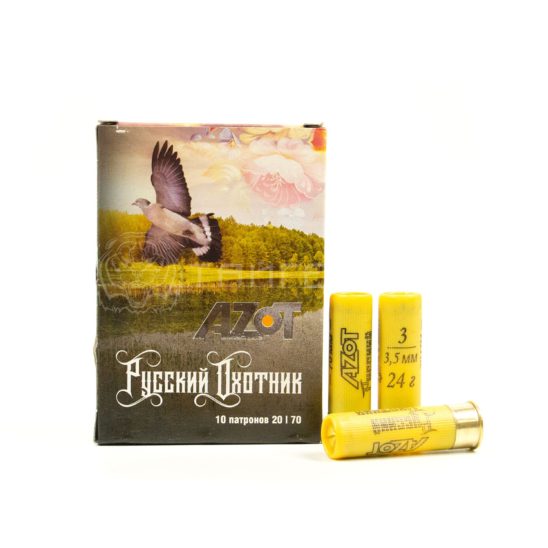 Гладкоствольный патрон от одного из лидирующих брендов на отечественном рынке боеприпасов НПФ «Азот». Эта компания берет свое начало аж с 1992 года и с тех пор постоянно развивает свои методы и технологии производства собственной продукции — в её распоряжении даже имеется собственная специализированная лаборатория «NGR», а опыт итальянских партнёров из «Baschieri & Pellagri» служит примером высокого качества для отечественного производителя. Тип снаряда — дробовой патрон с логотипом на желтой гильзе, калибра 20/70 диаметром 3,5мм, находящаяся в пыж-контейнере и обладающая удельным весом в 24 гр. Картонная упаковочная пачка вмещает в себя 10 зарядов. В целях избежания несчастных случаев при применении, этот товар настоятельно рекомендуется брать только для оружия с соответствующим калибром. Отлично подойдет как в охоте на среднюю и пернатую дичь, так и в развлекательной или соревновательной стрельбе на коротких дистанциях. (-/-)