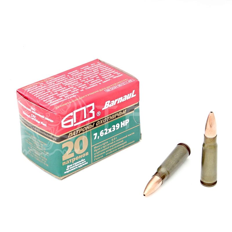 Патрон спортивно-охотничий для нарезного оружия 7,62*39 HP (экспансивная пуля). Лакированная гильза.