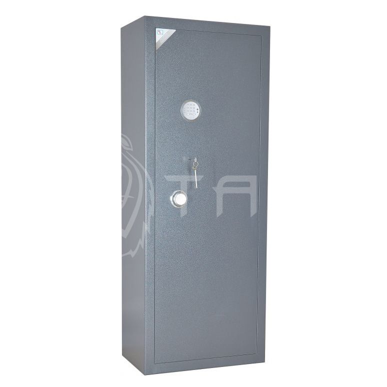 Шкаф оружейный СО-8ЭК на 8 стволов имеют толщиной 3 мм, дверь толщиной 5 мм. На задней стенке и днище корпуса расположены отверстия для крепления. Шкаф односекционный оснащен съемными полками и отделением под патроны. Ложементы — роликовые. Максимальная высота устанавливаемого оружия — 1380 мм. В дверь установлены ключевой 8-ми сувальдный замок с ригельной системой запирания в 3 стороны и электронный замок серии D-126. Диаметр ригеля 20 мм. Ключевой замок ЗАО «Про-Сам» г. Рязань или аналогичный замок другого производителя. Цвет: Серый.